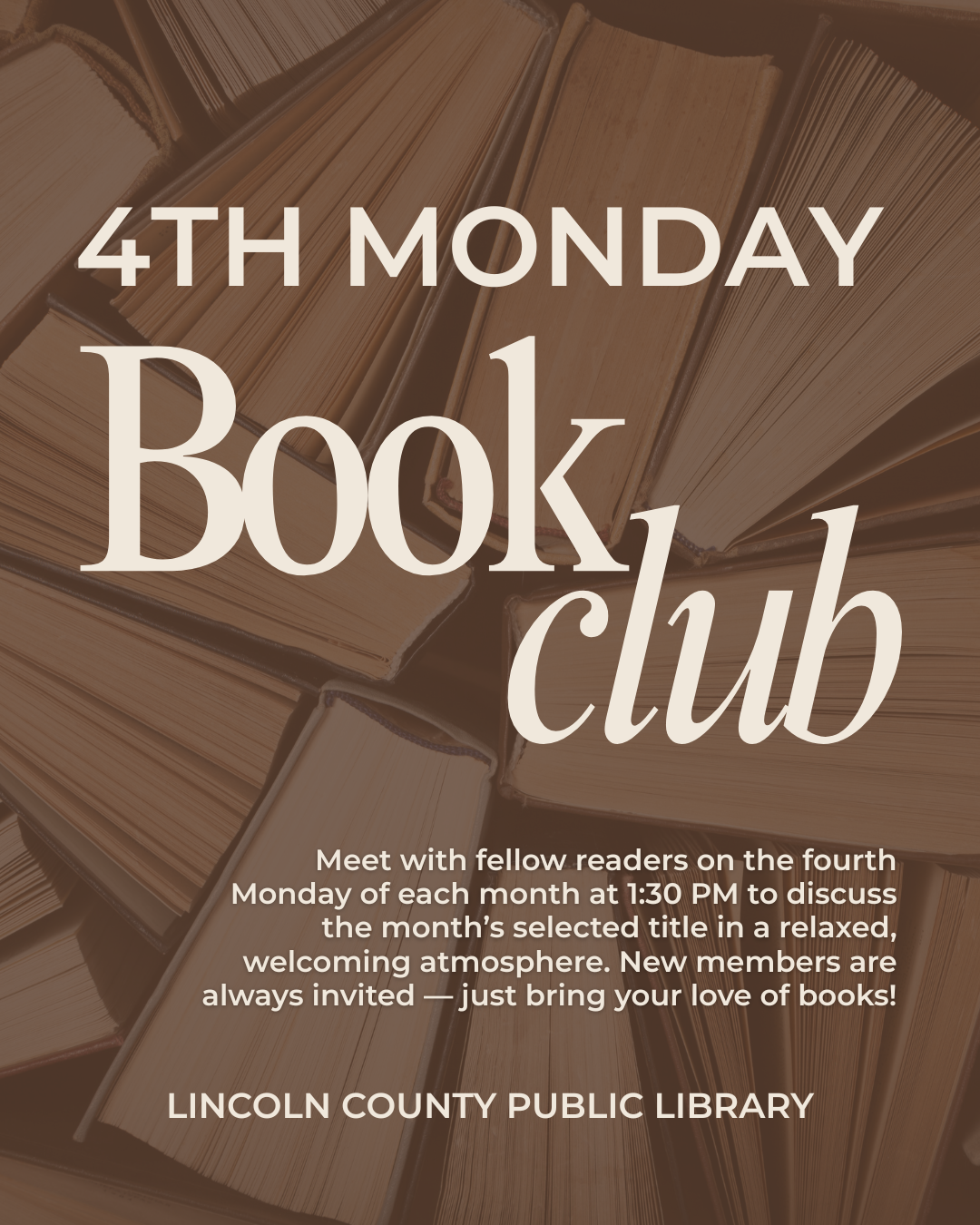 Looking for your next great read? Join us on the fourth Monday of each month at 1:30 PM to enjoy engaging discussions, new perspectives, and good company. All readers are welcome!